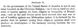 Art. 11. Como el Gobierno de los Estados Unidos de América no está, en ningún sentido, fundado en la religión cristiana; como en sí mismo no tiene carácter de enemistad contra las leyes, religión o tranquilidad de los musulmanes; y como dichos Estados nunca han entrado en guerra o acto de hostilidad contra ninguna nación mahometana, las partes declaran que ningún pretexto surgido de opiniones religiosas producirá jamás una interrupción de la armonía existente entre ambos países.