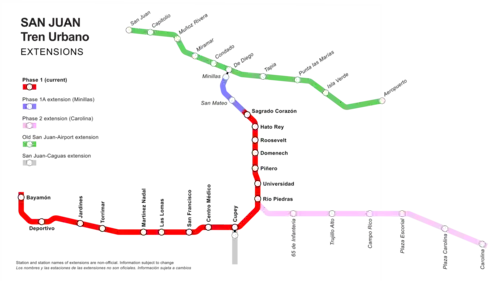 - Un segundo plan para el desarrollo de una línea hasta Caguas con un nuevo sistema de vehículos ferroviarios ligeros con futuras extensiones a través de la isla.[16]