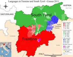 En la provincia autónoma de Bolzano-Bozen, la mayoría habla alemán (69,1% de la población) en su variedad vernácula surtirolesa, aunque en la capital Bolzano-Bozen el 73% de la población habla italiano como su idioma materno debido a la Italianización de Tirol meridional la burocracia y represión del alemán después de la anexión de la región a Italia en el año 1919.[13] La minoría de italófonos es significativa, un 26,5% de su población.[14] El ladino es el idioma oficial adicional en algunos municipios. Según el censo del año 2001, 103 de 116 comunas tienen una mayoría de hablantes nativos alemanes, 8 de hablantes ladinos y 5 de italiano. Hoy tanto italianos como alemanes tienen el estatus de idiomas cooficiales en la provincia de Bolzano-Bozen.