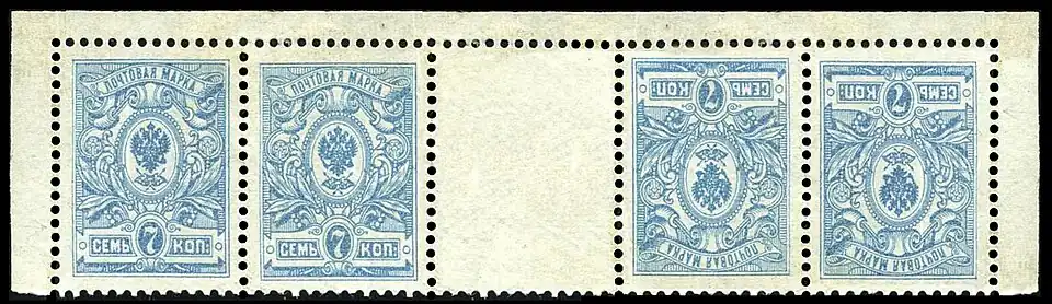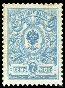 Poco después de entrar al mercado, se descubrió que en pliegos separados había detalles en las imágenes de tres estampillas. Lo que se explicaba porque la imprenta en San Petersburgo casi nunca se incluía tres planchas, preparadas de acuerdo al cliche intermedio. Aunque este error fue revelado por la misma imprenta 15 a 20 ejemplares salieron a la venta. En la rotación de 1908 a 1909 entraba una estampilla estándar al Imperio Ruso 17ma emisión, reemplazando las emisiones de los años 1889-1905. Las estampillas nuevas caracterizadas por imágenes y papeles, y por el control de grilla. En las comúnmente usadas de 7 kopek merece mención la emitida en diciembre de 1908.