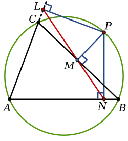 Si P está en la circunferencia circunscrita del triángulo, LMN se colapsa en una línea recta, denominada línea podal, o también recta de Simson (en memoria de Robert Simson).