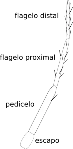 Los triatominos poseen antenas de cuatro segmentos en ambos lados de la cabeza y frente a los ojos. El primer segmento basal o escapo está unido a la cabeza, luego le sigue un pedicelo y un flagelo compuesto en dos subsegmentos: flagelo distal y flagelo proximal. A estos dos últimos también se les llama flagelómeros y contienen la mayor parte de los pelos (u otras estructuras cuticulares) sensoriales que contienen sensores químicos, térmicos y táctiles.