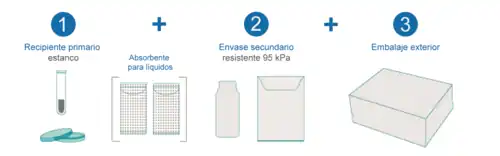 En el transporte de muestras de materias biológicas de la categoría B (UN 3373), que pueden ser o son infecciosas, o de categoría A (UN 2814 y UN 2900), que son materias infecciosas de alto riesgo, se emplea un sistema de triple embalaje con el fin de garantizar la integridad de las muestras y, en caso de accidente, minimizar la exposición a estas por parte de personas y medio ambiente. Según la Instrucción de Embalaje P650 del Acuerdo ADR (Instrucción de Embalaje P620 para muestras de categoría A), consta de tres tipos de recipientes: