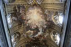 Gian Lorenzo Bernini recomendó a Giovanni Battista Gaulli (Baciccio) como pintor de los frescos de la cúpula de la iglesia del Gesù. Además, Bernini también inspiró algunas de las representaciones, [3] sin la influencia de la ilusión generada por la fusión de arquitectura y escultura que caracteriza las obras de Bernini, es posible afirmar que el resultado de Gaulli habría sido notablemente distinto.[4] La visión del cielo celestial sobre la bóveda subraya el papel de la Iglesia como intermediaria entre el mundo mortal y la salvación eterna.[5] Además, Baciccio confirió a la escena una profunda teatralidad, similar a la que aparece en la Capilla Cornaro.