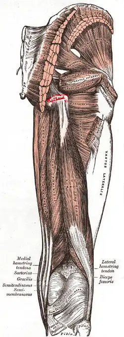 - la mitad interna da inserción al ligamento sacrociático mayor o sacrotuberoso.