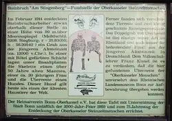 - Anne Bauer: Die Steinzeitmenschen von Oberkassel – Ein Bericht über das Doppelgrab am Stingenberg. Nr. 17 der Schriftenreihe des Heimatvereins Bonn-Oberkassel e. V., 2. Auflage, 2004