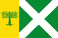 - Paño rectangular, de proporción 2/3. Tercio al asta amarillo con una encina verde. El batiente de color verde con un aspa blanca.[9]