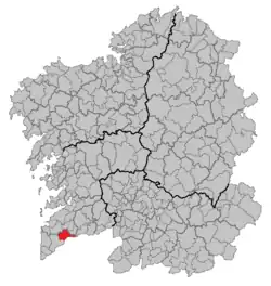 Integrado en la comarca de Bajo Miño, de la que ejerce de capital, se sitúa a 52 kilómetros de la capital provincial.