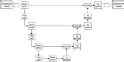 La red consta de una ruta de contracción y una ruta expansiva, lo que le confiere la arquitectura en forma de u. La ruta de contracción es una red convolucional típica que consiste en la aplicación repetida de convoluciones, cada una de ellas seguida de una unidad lineal rectificada (ReLU) y una operación de agrupación máxima. Durante la contracción, la información espacial se reduce mientras que la información de características aumenta. La vía expansiva combina la información espacial y de rasgos mediante una secuencia de convoluciones ascendentes y concatenaciones con rasgos de alta resolución procedentes de la vía de contracción.[4]