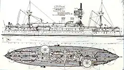 • 4 cañones de 254 mm/35 (10") (2 × 2) • 6 cañones de 152 mm (6") (6 × 1) • 7 cañones de 6 libras • 4 cañones de una libra • 4 ametralladoras Gatling de 11,43 mm (.45) • 4 tubos lanzatorpedos de 457 mm (18") | |