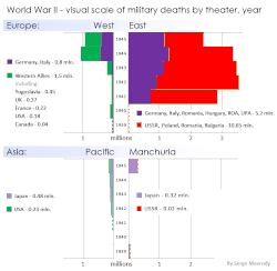 La etnia más afectada en números absolutos fue con gran diferencia la rusa, contabilizandose más de 15 millones de rusos étnicos muertos, tanto militares como civiles (en comparación, el Holocausto de los judíos en toda Europa, según distintas fuentes, afectó a un tercio de este número, se llevó las vidas de entre 4 869 860 y 5 894 716 personas, aunque porcentualmente representa una media mayor del 55,1 % del tamaño del grupo étnico en 1933.[9]) Estando en el epicentro del estallido de la guerra, Polonia fue el país que perdió porcentualmente más población: entre el 16,93 % y el 17,22 %, y el cuarto en número total llegando a 6,8 millones de pérdidas humanas solo superada por la URSS, China, y la propia Alemania nazi.[10]