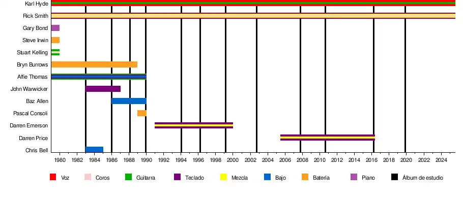 - Karl Hyde (nacido el 10 de mayo de 1957, Worcester) - voz, guitarra (1986-presente)