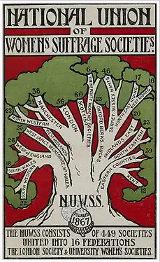 La Unión Nacional de Sociedades de Sufragio Femenino (en inglés, National Union of Women's Suffrage Societies, NUWSS) se fundó en 1897 como paraguas de todas las organizaciones sufragistas de Inglaterra, Escocia e Irlanda.[1] Fue fundada y liderada por la escritora, política y sindicalista Millicent Garret Fawcett (1847 - 1929) que presidió la organización durante más de dos décadas. La NUWSS fue la primera organización que organizó una gran manifestación en Londres, el 13 de junio de 1908 para reivindicar el voto de las mujeres. Una semana más tarde siguió la convocatoria la WSPU..[2]