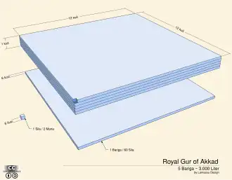 Una mejora importante llegó en 2150 a. C. durante el imperio acadio bajo el reinado de Naram-Sin cuando se unificaron los diferentes sistemas con un estándar único oficial, el cubo gur real.[2] Su reforma se considera el primer sistema de medida estandarizado en Mesopotamia. El cubo gur real (en cuneiforme: LU2.GAL.GUR, 𒈚𒄥; en acadio: šarru kurru) era un cuboide teórico de agua de aproximadamente 6m × 6m × 0.5m del que se podían derivar todas las demás unidades. Los neosumerios continuaron usando el cubo gur real como se indica en la carta de Nanse, escrita por Gudea en el 2000 a. C. El uso de este mismo estándar continuó a través de los imperios babilónico, asirio y persa.