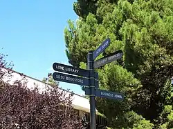 - La biblioteca del campus, ahora conocido como la Malcolm A. Love Library, adquirió su libro 100.000 el 21 de mayo de 1944. Para finales de la Segunda Guerra Mundial estaba adicionando aproximadamente 8000 libros al año.[44] En 1959, se añadió 12 000 m, pero fue considerada demasiado pequeña.[45] En 1952, la biblioteca tenía 125.000 libros, y las regulaciones del estado requirieron que los libros antiguos se eliminarán antes de poder añadir otros nuevos. En 1965, había más de 300.000 libros alojados en una biblioteca que podrían albergar 230.000. Esto fue clasificado más alto en las universidades estatales, en términos de tamaño de la biblioteca. En la década de 1960, la construcción de una nueva biblioteca comenzó, lo que requirió reubicar a Scripps Cottage. El edificio de $8.000.000 dólares fue diseñado con 91,5 km de espacio para dar cabida a un millón de libros.[46] En febrero de 1971, la biblioteca abrió, albergando 700.000 libros, y fue nombrado bajo el nombre del presidente Malcolm A. Love por su popularidad en el campus y su papel en traer el nombre de Estado al estatus de la universidad.[47] El Gobernador Ronald Reagan dijo que la biblioteca podría "... servir como monumento duradero al hombre que dirigió la universidad a través de sus dolores de crecimiento ... para una de las mejores universidades del estado de California."[48] El edificio, era de cinco pisos de altura y fue el edificio más grande en el campus. Una escultura de cuatro pisos titulado "Hanging Discus" por el escultor George Baker fue diseñado específicamente para la biblioteca y se añadió a una escalera interior en noviembre de 1973.[49]