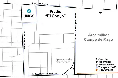 - ↑ http://www.ungs.edu.ar/cm/uploaded_files/image/como_llegar/horario_micro.gif Archivado el 5 de marzo de 2016 en Wayback Machine. Transporte gratuito UNGS