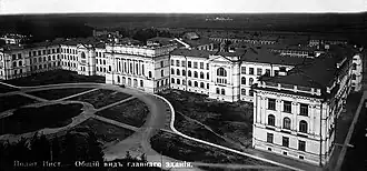 El diseño y la construcción fue llevada a cabo por el gabinete arquitectónico dirigido por Ernest Virrij. El proyecto consistía en una serie de edificios que forman una ciudad autónoma universitaria, similar a las existentes de Cambridge y Oxford. Se construyó un edificio principal, un pabellón químico, dos residencias comunales y un cuerpo mecánico. Virrij se inspiró para el edificio principal en el proyecto para la escuela superior técnica de Berlín. La parte central del edificio y su plano general casi imitan por completo la construcción berlinesa.
