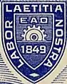 Abajo, de anaranjado, una cinta cargada de letras de sable o negro, en la siniestra "Labor", en el centro "Lætitia", y a la diestra "Nostra".
