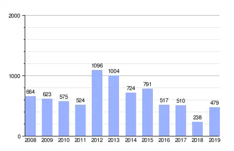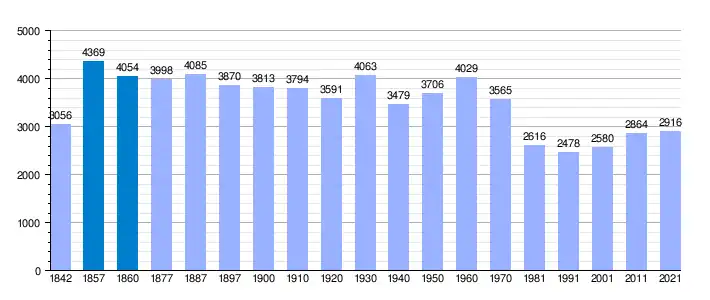 | Gráfica de evolución demográfica de Vélez de Benaudalla[4] entre 1842 y 2021 |