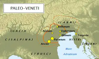 Más allá de ese último río se habían establecido los ilirios, aunque hasta el Isonzo, la presencia véneta era tan fuerte que se podía hablar de una población venetoilírica.[2] En cambio, las fronteras del norte eran menos definidas y homogéneas. En cualquier caso, el territorio véneto subía por los ríos Adige, Brenta y el Piave hacia los Alpes, que formaban una frontera natural. La presencia véneta en los Alpes ha dejado registro especialmente en las Dolomitas de Cadore, en Lagole.