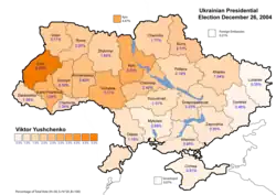 Ya con su rostro desfigurado por la dioxina, las elecciones presidenciales de primera vuelta fueron pautadas para el 31 de octubre de 2004, con una alianza prooccidental entre Yúschenko de Nuestra Ucrania y Yulia Timoshenko del Batkivshchina[4] enfrentados al prorruso y candidato oficial Víktor Yanukóvich del Partido de las Regiones. El resultado de primera vuelta dio la victoria a Yúschenko con el 39,87 % sobre Yanukóvich con el 39,32 % pese a las irregularidades presentadas y los actos de corrupción.