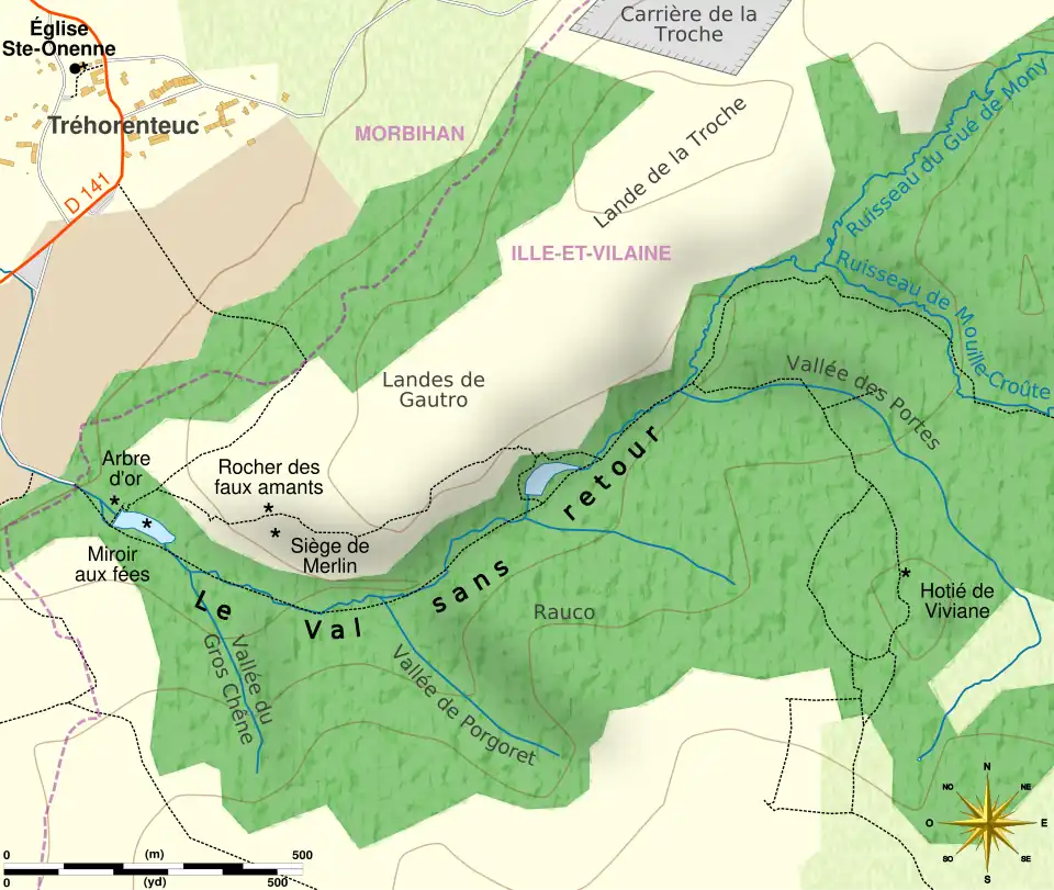 Toda esta área está extremadamente atormentada. Los valles se suceden, las rocas y las colinas se entrelazan y forman una especie de laberinto que hace que caminar sea singularmente difícil. Las laderas son arduas, el bosque, los arbustos, los matorrales forman obstáculos que no son fáciles de superar. Es todo esto, sin duda, lo que ha dado lugar a la fábula del Val sans retour, del que se habla a menudo en las novelas de la Mesa Redonda.Félix Bellamy, La forêt de Bréchéliant : la fontaine de Bérenton, quelques lieux d'alentour, les principaux personnages qui s'y rapportent.[40]