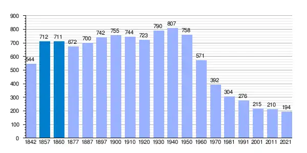 | Gráfica de evolución demográfica de Valdenebro de los Valles[4] entre 1842 y 2021 |