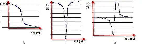 - Valoración potenciométrica: Es una medida basada en la diferencia de potencial entre un electrodo adecuado frente a un electrodo de referencia (electrodo de calomelanos de potencial fijo) en función del volumen de sustancia valorante. No confundir con la medida directa de potencial que efectúa el pH-metro. Proporcionan resultados más fiables que las valoraciones con indicadores químicos o ácido-base. Se emplean dos electrodos, en lugar de uno sólo. En el punto final hay una rápida modificación del potencial. Representando la derivada en función del volumen, se observa un pico que corresponde al punto final. También se observa en la segunda derivada. Estas medidas de potencial también permiten calcular la constante de disociación del ácido o la base que se está valorando.[6]