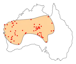 El varano gigante australiano se encuentran en las áridas áreas desérticas de Australia Occidental, Australia Meridional, el Territorio del Norte y Queensland. Sus hábitats consisten en afloramientos rocosos y gargantas, con tierra compactada y piedras sueltas.