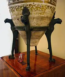 Gran vaso árabe, granadino, barnizado con fondo blanco, arabescos y caligrafía cúfica de color amarillo con reflejos metálicos de varios colores. Tien forma de ánfora, su altura es de un metro y doce centímetros, el pie modelado por Fortuny se compone de cuatro patas de león, valuado cinco mil francos.[9]
