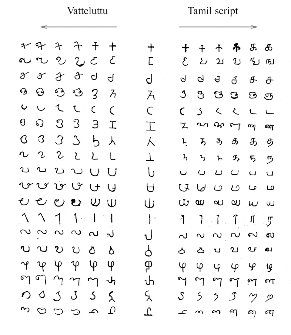 Esta imagen muestra la evolución divergente del tamil y el vatteluttu. La escritura vatteluttu se muestra en la columna de la izquierda, el Tamil Brahmi en la del medio y el tamil en la de la derecha. Los testimonios más tempranos de ambas se hallan junto al centro y los más tardíos progresando hacia los costados.
