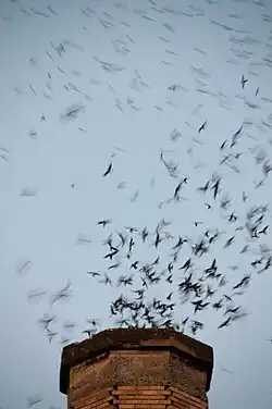 ![]() Bandada de vencejos se arremolinan en torno a la chimenea de una escuela primaria para pasar la noche. | ||