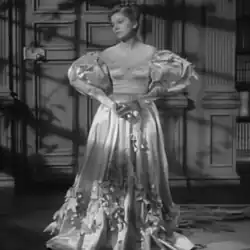 El vestido, compuesto de aproximadamente 30 metros de seda satinada en tono marfil y adornado en los filos de las estructuras con hilo metálico,[5][25][36] posee mangas abullonadas estilo «pierna de cordero» y cuenta con una larga cola y más de 150 hojas de seda curvadas y alrededor de 20 hojas de encaje decorando el escote y la falda (de corte similar al guardainfante) a modo de enredadera, albergando como únicos complementos un velo de tul, un par de guantes y un collar de perlas de tres hileras.[13][37][38] Respecto al color, el tono marfil era comúnmente empleado para mostrar prendas blancas en pantalla debido a las limitaciones técnicas de la época; en la era del Technicolor, los diseñadores debían tener en cuenta que las tonalidades de las prendas se veían de forma distinta en cámara tanto en color como en blanco y negro, siendo uno de los casos más llamativos el vestido supuestamente rojo que Bette Davis lució en Jezabel (1938), el cual era en realidad de color marrón debido a que el color rojo no lucía adecuadamente en blanco y negro. Este inconveniente se daba también con el blanco tanto en blanco y negro como en color, motivo por el que las telas solían teñirse de azul o rosa claro, circunstancia que se trasladaba incluso a la ropa de cama, siendo un caso destacado el traje azul claro (blanco en pantalla) de Norma Shearer en María Antonieta (1938),[27] película filmada en blanco y negro aunque concebida para ser rodada en color. El intenso tono marfil que el vestido posee en la actualidad es, por tanto, original a diferencia del de otras prendas de la época, como el vestido verde de la escena de la barbacoa, el vestido blanco de Marilyn Monroe en The Seven Year Itch (1955), y el vestido de «Amado Mío», lucido por Rita Hayworth en Gilda (1946), los cuales fueron adquiriendo una tonalidad cruda con los años a causa del envejecimiento del tejido.[39]