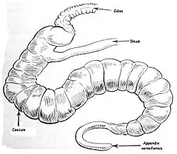 En los humanos modernos, el apéndice vermiforme es un vestigio de un órgano redundante que en las especies ancestrales tenía funciones digestivas, al igual que lo hace en las especies existentes en las que la flora intestinal hidroliza celulosa y materiales vegetales indigeribles similares.[9] Algunos animales herbívoros, como los conejos, tienen un apéndice vermiforme terminal y ciego que aparentemente tienen parches de tejido con funciones inmunitarias y también pueden ser importantes para mantener la composición de la flora intestinal. Sin embargo, no parece tener mucha función digestiva, y no está presente en todos los herbívoros, incluso en aquellos con grandes ciegos.[10] Sin embargo, como se muestra en las imágenes adjuntas, el apéndice humano es casi comparable al tamaño del conejo, aunque el ciego se reduce a un único bulto donde el íleon desemboca en el colon.[6] Algunos animales carnívoros también pueden tener apéndices, pero rara vez tienen más que ciegos vestigiales.[11] En línea con la posibilidad de que los órganos vestigiales desarrollen nuevas funciones, algunas investigaciones sugieren que el apéndice puede proteger contra la pérdida de bacterias simbióticas que ayudan a la digestión, aunque es poco probable que sea una función nueva, dada la presencia de apéndices vermiformes en muchos herbívoros.[12][13] Las poblaciones de bacterias intestinales atrincheradas en el apéndice pueden apoyar el restablecimiento rápido de la flora del intestino grueso después de una enfermedad, envenenamiento o después de que un tratamiento con antibióticos agota o causa cambios nocivos en la población bacteriana del colon.[14] Un estudio de 2013, sin embargo, refuta la idea de una relación inversa entre el tamaño del ciego y el tamaño y la presencia del apéndice. Está ampliamente presente en los euarcontoglires (un superorden de mamíferos que incluye roedores y primates) y también ha evolucionado convergentemente en los marsupiales diprotodontes, monotremas, y es muy diverso en tamaño y forma, lo que podría sugerir que no es vestigial. Los investigadores deducen que el apéndice tiene la capacidad de proteger bacterias buenas en el intestino. De esta forma, cuando el intestino se ve afectado por una diarrea u otra enfermedad que limpia los intestinos, las bacterias buenas en el apéndice pueden repoblar el sistema digestivo y mantener a la persona sana.[15]