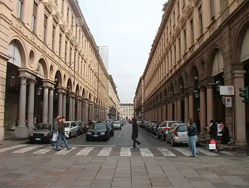 La Via Nuova o Contrada Nuova, como se llamó cuando se creó a finales del siglo XVI, fue realizada por el arquitecto Ascanio Vittozzi, por voluntad del duque Carlos Manuel I de Saboya. Medía entonces diez metros de anchura. La calle se convirtió pronto en uno de los ejes principales de la ciudad. Se mencionó en una curiosa medida de Carlos Manuel II de Saboya, el 29 de octubre de 1672, que prohibía las elevaciones de la calle por encima de la cornisa: