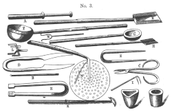 Los vidrieros usan en la fábrica de vidrios hornos, carquesas, "maniolas", crucetas. Hay hornos de reverberación, "poyatillas", sopletes, igualadores, hierros, formas, tijeras. En el taller de vidrio, lo aprietan sobre el mármol, modelan, cortan, y lo labran (a follajes, a perfiles, a esmalte, a oro, a colores y pinturas). El virtuosismo del oficio queda de manifiesto cuando lo tiran en hilo, lo hilan, sacan pelucas, hacen toda suerte de tubos y fingen piedras preciosas.[1]
