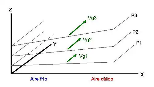 Así, en altura encontraremos que existe un "incremento de presión" en las zonas de aire cálido respecto a las zonas de aire frío. A priori esperaríamos que el viento fluyera de estas zonas de mayor presión a las de menor pero, al igual que sucede con el viento geostrófico, interviene la fuerza de Coriolis, que desvía el viento hasta que se produce un equilibrio entre el gradiente de presión y Coriolis.