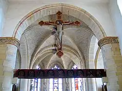 La viga de gloria se llamaba así porque lleva un gran crucifijo en el centro, con o sin estatuas u ornamentos relacionados con la Crucifixión (habitualmente acompañado por María y San Juan, instrumentos de la Pasión). El crucifijo era lo suficientemente grande para que fuese visible desde toda la iglesia. A veces, los extremos de la cruz llevaban flores de lis o medallones con los símbolos de los cuatro evangelistas.[2] El travesaño puede tener diversas formas y ornamentaciones, desde una simple viga recta, o con curvas y contracurvas como en la época barroca. Encima pueden colocarse relicarios u objetos sagrados diversos, como pequeños santuarios o bolsas de reliquias.