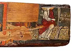 7. Grupo de las Marías ante el sepulcro vacío, símbolo de la Resurrección con la inscripción ECCE LO... UBI POS ....