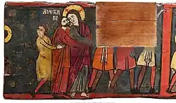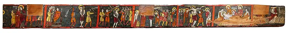 El temario de la viga es la relación en seis escenas del ciclo de la Pasión de Cristo y una séptima que alude a su Resurrección. Se presentan los episodios en orden de izquierda a derecha, solo con una separación realizada mediante unas líneas rojas que enmarcan los diversos pasajes. Las escenas de la Detención, la Crucifixión y el Grupo de las Marías están dañadas por anclajes rectangulares para la aplicación de ensamblajes seguramente para ser de nuevo utilizada o para un remodelado de su uso.[10]