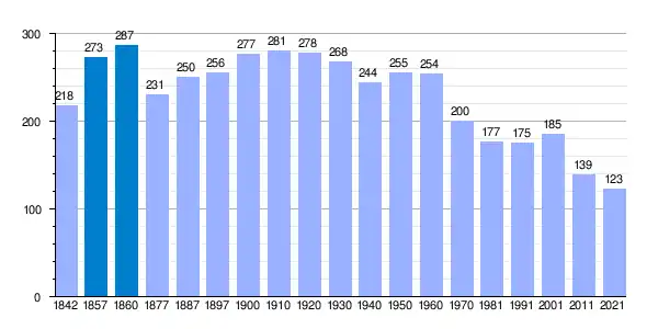 | Gráfica de evolución demográfica de Villán de Tordesillas[3] entre 1842 y 2021 |