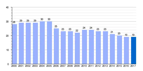 | Gráfica de evolución demográfica de Villafría[4] entre 2000 y 2017 |