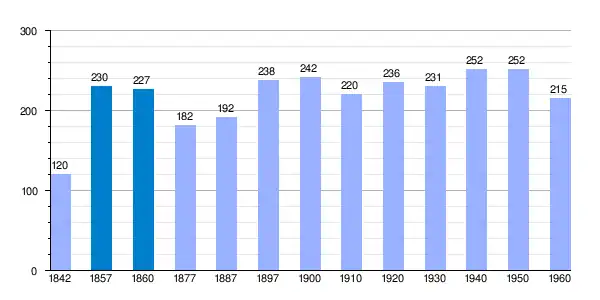| Gráfica de evolución demográfica de Villagonzalo de Coca[3] entre 1842 y 1960 |