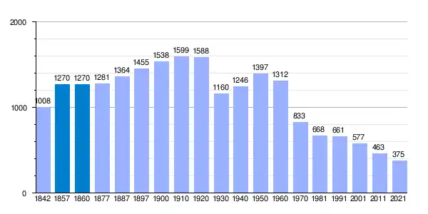 | Gráfica de evolución demográfica de Villamor de los Escuderos[13] entre 1842 y 2021 |