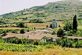 - [6][2] Se ubica en un alto. Obra de fines del siglo XVI. Construida en mampostería con refuerzos de sillares. Dos naves con bóvedas. De su pasado románico hay elementos reaprovechados fuera de contexto. Tiene una sencilla portada románica. Pila bautismal románica, similar a las de Melgosa de Villadiego y Hormicedo. Mesa de altar románica usada como banco. Torre con escalera de caracol adosada lateralmente con base renacentista (siglo XVI) y remate barroco (siglo XVIII). Capillas adosadas (lateral y cabecera). Coro del siglo XVII de tipo arte morisco renaciente; tiene canecillos de dos lóbulos en forma de perfil de ese, divididos por una cuerda o soga en dos partes simétricas; motivos geométricos de tipo manierista como son los rectángulos divididos en compartimentos cuadrados y ovalados; predominan en el coro las acanaladuras a modo de triglifos, redes rombos, óvalos y medias lunas, ornamentación que se debe considerar como un arcaísmo a nivel local.[16]