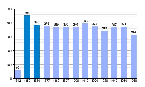 | Gráfica de evolución demográfica de Villanueva de Puerta[14] entre 1842 y 1960 |