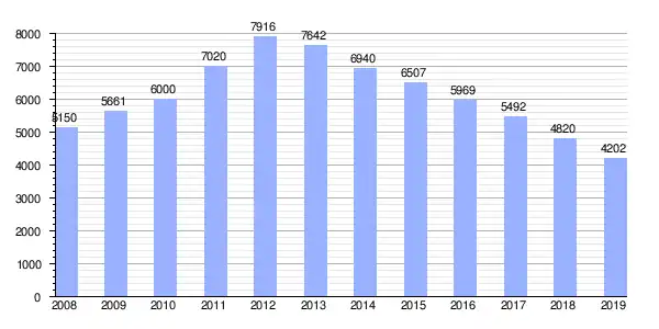 | Gráfica de evolución demográfica de Villanueva del Arzobispo[1] entre 1842 y 2021 |