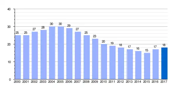 | Gráfica de evolución demográfica de Villarejo-Sobrehuerta entre 2000 y 2017 |
