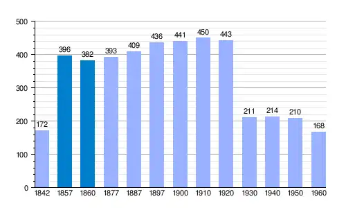 | Gráfica de evolución demográfica de Villarejo de Medina[4] entre 1842 y 1960 |