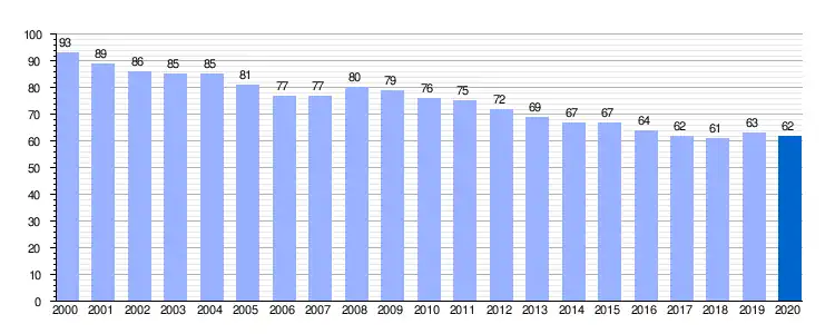 | Gráfica de evolución demográfica de Villaverde de la Peña entre 2000 y 2020 |